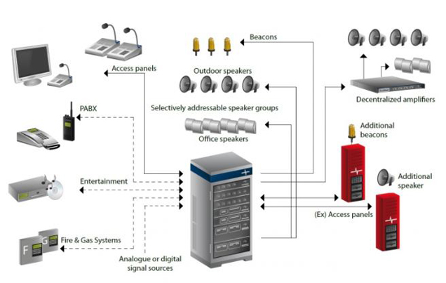 A public address system (PA system) is an electronic system comprising microphones, amplifiers, loudspeakers, and related equipment. It increases the apparent volume (loudness) of a human voice, musical instrument, or other acoustic sound source or recorded sound or music. PA systems are used in any public venue that requires that an announcer, performer, etc. be sufficiently audible at a distance or over a large area. Typical applications include sports stadiums, public transportation vehicles and facilities, and live or recorded music venues and events. A PA system may include multiple microphones or other sound sources, a mixing console to combine and modify multiple sources, and multiple amplifiers and loudspeakers for louder volume or wider distribution.